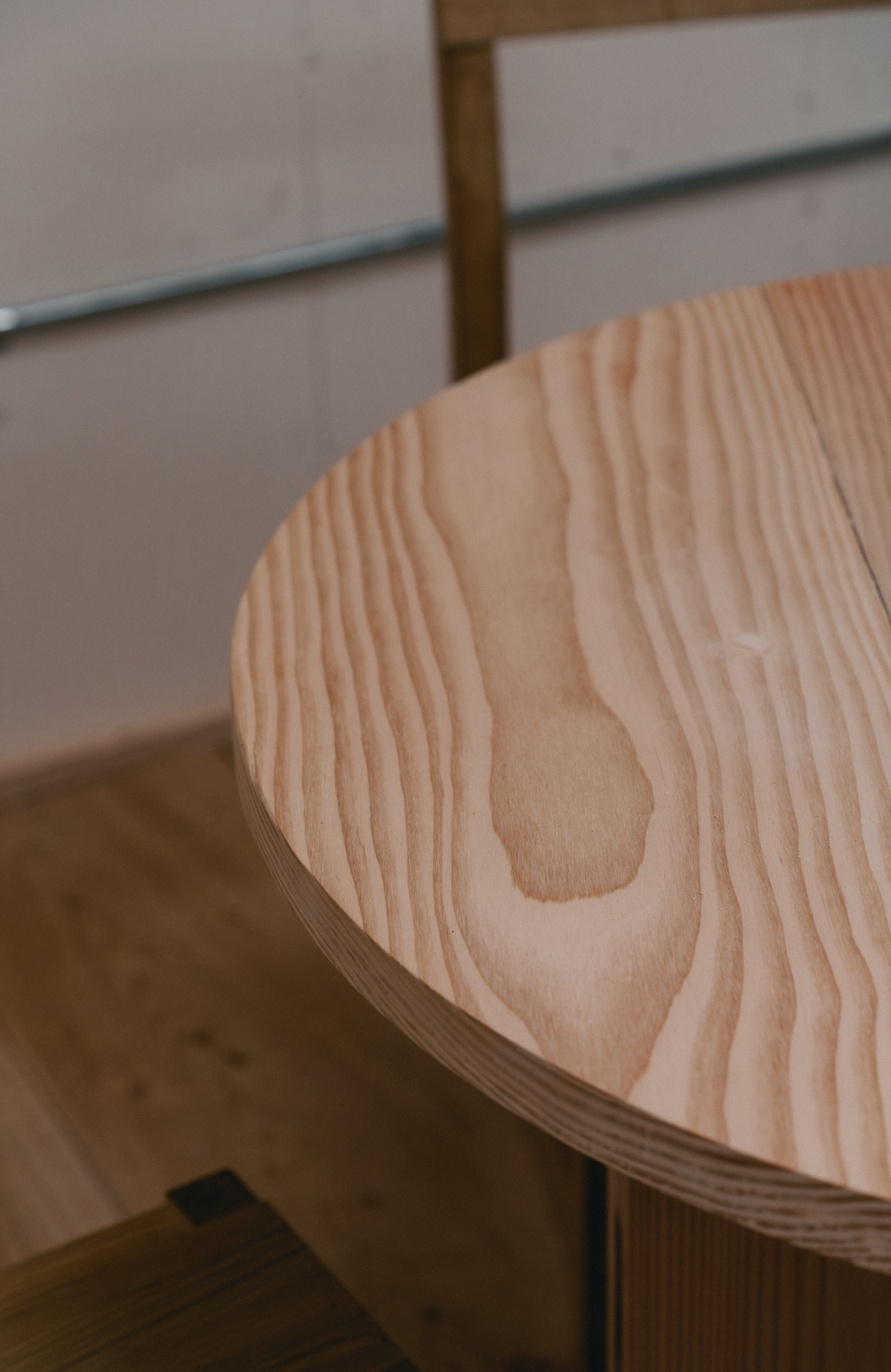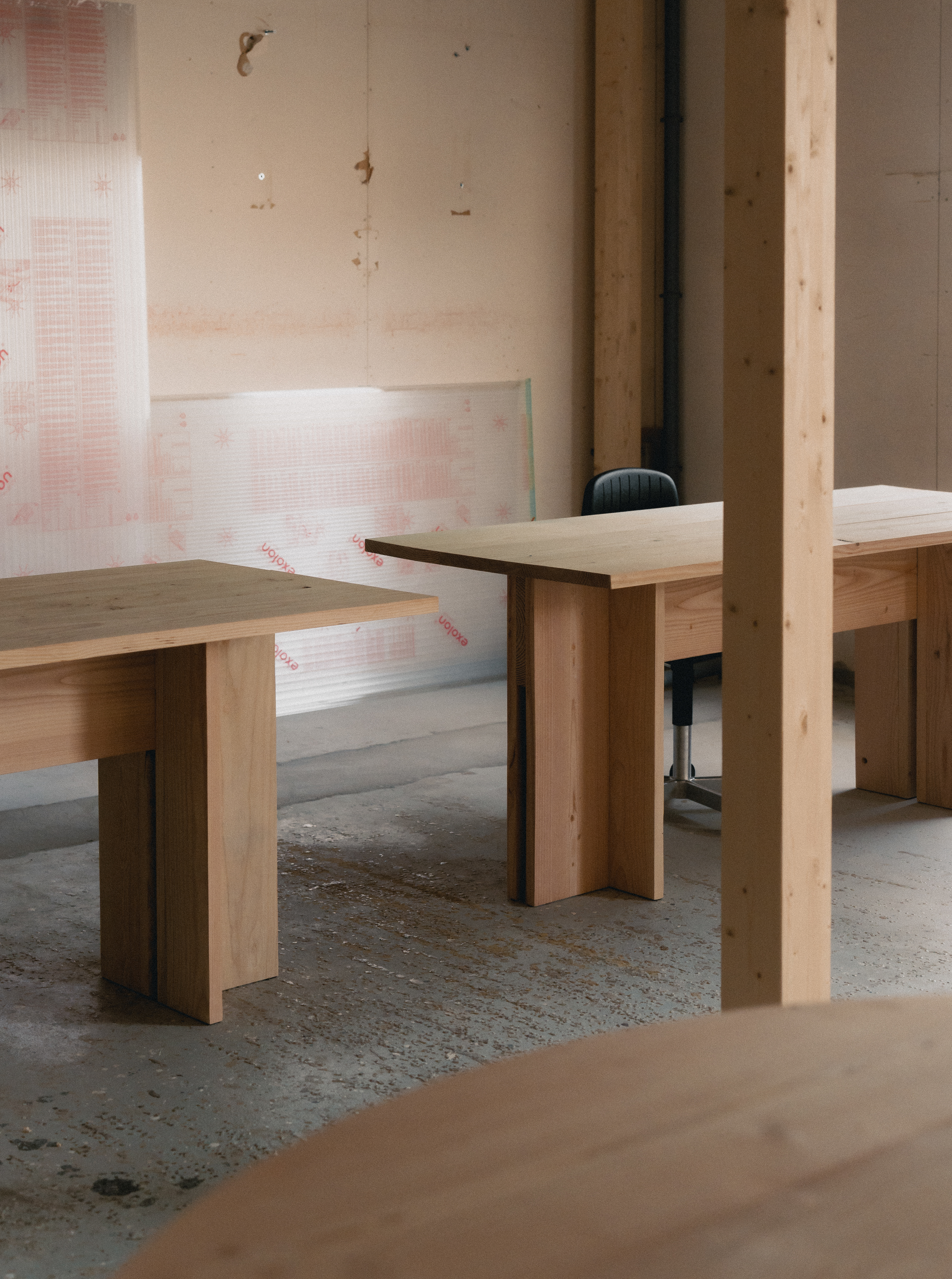Bordene er skabt med 2. sorterings planker og afskær fra Dinesen, hvilket giver hvert møbel et levende udtryk og en varm, taktil overflade. Den enkle og robuste konstruktion gør bordet til mere end bare en funktionel genstand; det bliver et fysisk udtryk for samarbejdet mellem de forskellige fagligheder og den gensidige inspiration, der opstår her.